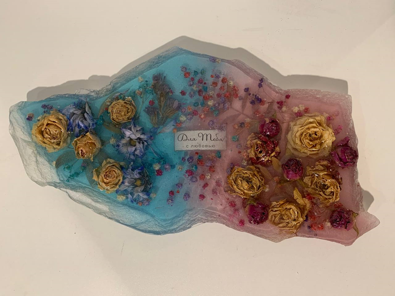 - В вводной части мы детально изучим базу создания изделия: что такое эпоксидная смола, какие виды смол существуют, как выбрать смолу в зависимости от изделия; изучим технологию создания изделия и её особенности; как произвести дегазацию (вытеснение из состава пузырьков воздуха); виды форм для заливки изделий (опалубка, молды, борды); какие красители и пигменты лучше использовать, разницу красителей, секреты специальных добавок; а также расскажем про правила сбора и техники сушки цветов.